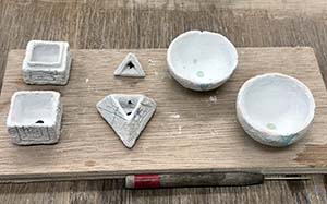 今日は午後、雨が降りそうな中、歩いて自由が丘の陶芸教室に行った。(陶芸作業中に雨が降った模様だが帰りには雨は止んでいた)先日、素焼きを依頼したミニチュアの容器(立方体、三角体、球体)に釉薬をかけるためであるが、教室の雰囲気は良く、途中でチョコレートまで配布された。釉薬掛けは順調に進んだが、こればかりは本焼成の結果を見ないと何とも言えない。釉薬掛けを終えた状態の写真を下に掲載する。これまで作ったことのないようなミニチュア容器。どちらかというと大型の仕掛け作品が私の特徴であったが、ミニチュアもそれなりに面白い。一番は良いことはスペースを取らないことか。置き場に困るとか処分に困るといった心配も最小限。どんな形にしろ制作意欲が続くことが有難い・・。