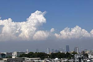 今日の東京の気温は35℃を越す猛暑日となり、またも熱中症アラートが発令された。こんな中で朝からテニスをした。爽やかな秋晴れを期待したが今年はそうは行かない。今日が最後の猛暑日だといいわね、と仲間が皆話していた。今日のテニスも10時半には終了とした。無理をしない要領は皆が分かっているので安心感がある。・・午後は近所の医者と薬局へ。今日、予約をしていた訳ではないが、このタイミングで医者や薬局に行けるのは体力的にも余裕があったのだろう。医者に行く前、14:21分に東京の中心部の空を撮影した写真を下に掲載した。まるで真夏の雲。暑さは簡単には収まらない・・。