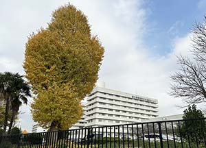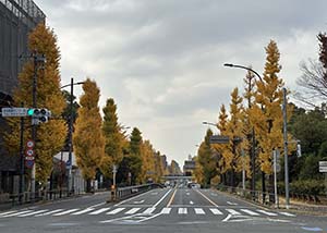 2025-12-02駒沢通りの銀杏並木(右が駒沢公園) 東京医療センターの銀杏の木(後ろの建物が病院)