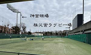2026-01-07外苑のテニスコートにて(裏の建築物は神宮球場)